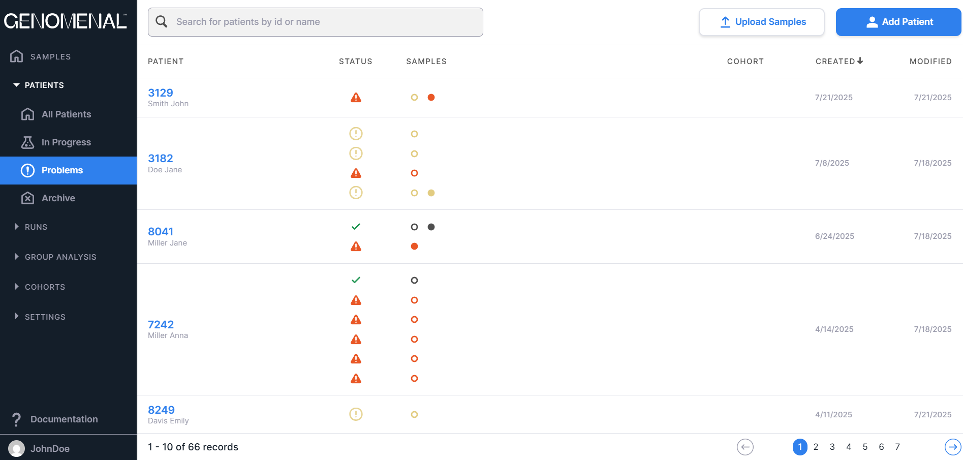 Delete patient data and samples from the system by hovering over the patient's row and clicking on
