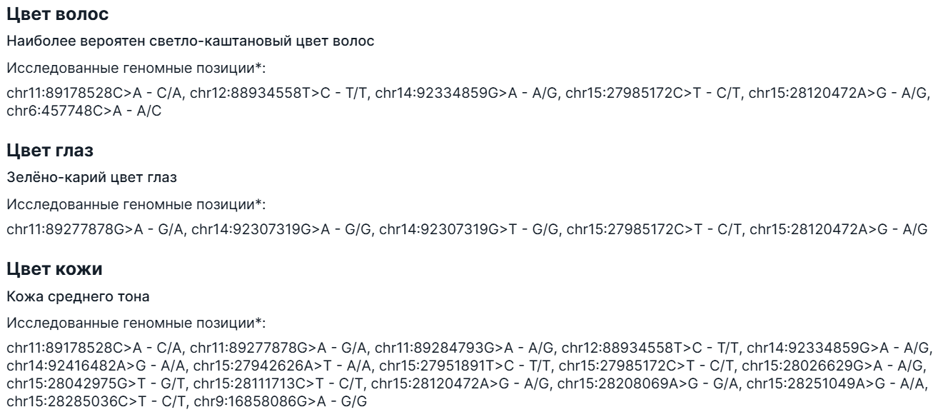 Для каждого признака в отчёте приводится результат предсказания, а также список проанализированных геномных позиций в следующем формате: "хромосома":"позиция на хромосоме" "референсный нуклеотид">"альтернативный нуклеотид" - "генотип в данных".